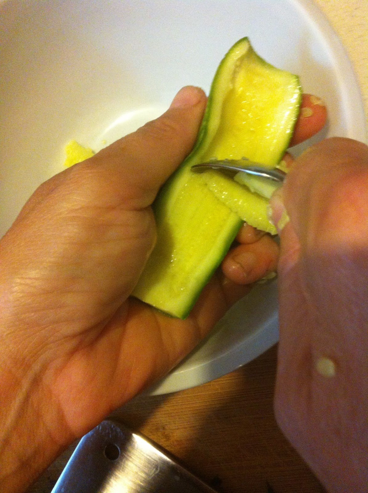 2. Tagliare le zucchine a metà e svuotarle della polpa, raccogliendola in una zuppiera
