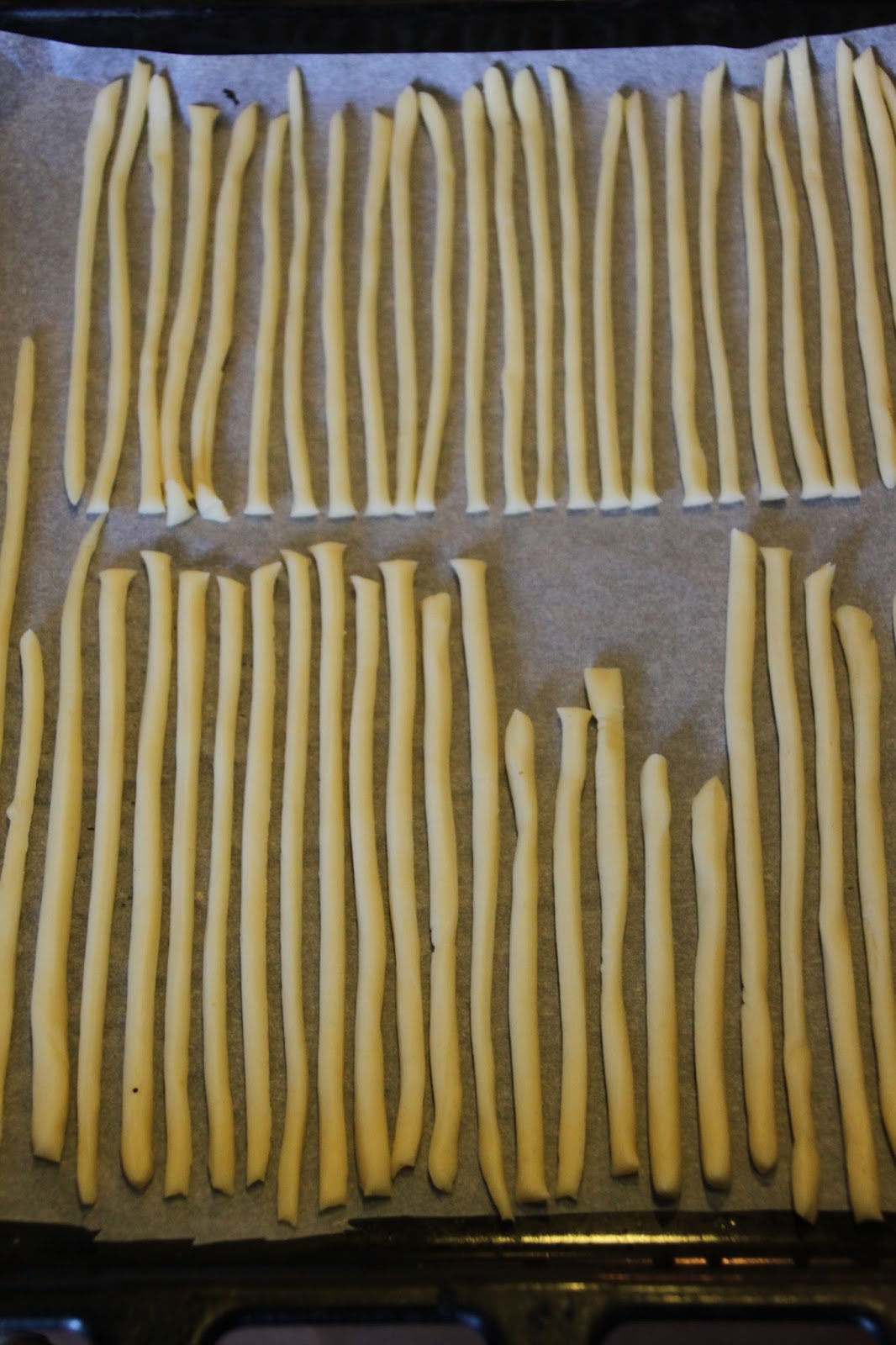 Tagliate con la rotella tante piccole striscioline ( lunghe ca 10 cm ) che arrotolerete su loro stesse per renderle più tonde e adagerete su una teglia foderata di carta da forno