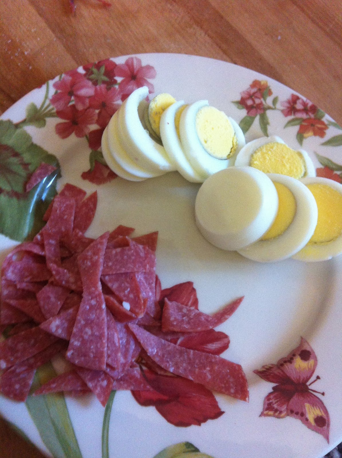 Lessate le uova e tagliate a listarelle il salame.