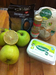 Tagliate le mele a cubetti, non troppo piccoli altrimenti rilasciano troppa acqua durante la cottura. Spremete il 1/2 limone e filtrate per eliminare i semini. In una pentola antiaderente sciogliete il burro di soia o  la margarina e appena sarà completamente sciolta aggiungere le mele, il limone, lo zucchero e la cannella, mescolare per 2 minuti a fuoco vivo. Spegnete il gas e lasciate le mele sul piano cottura, in modo tale da renderle ancora più morbide grazie al calore.