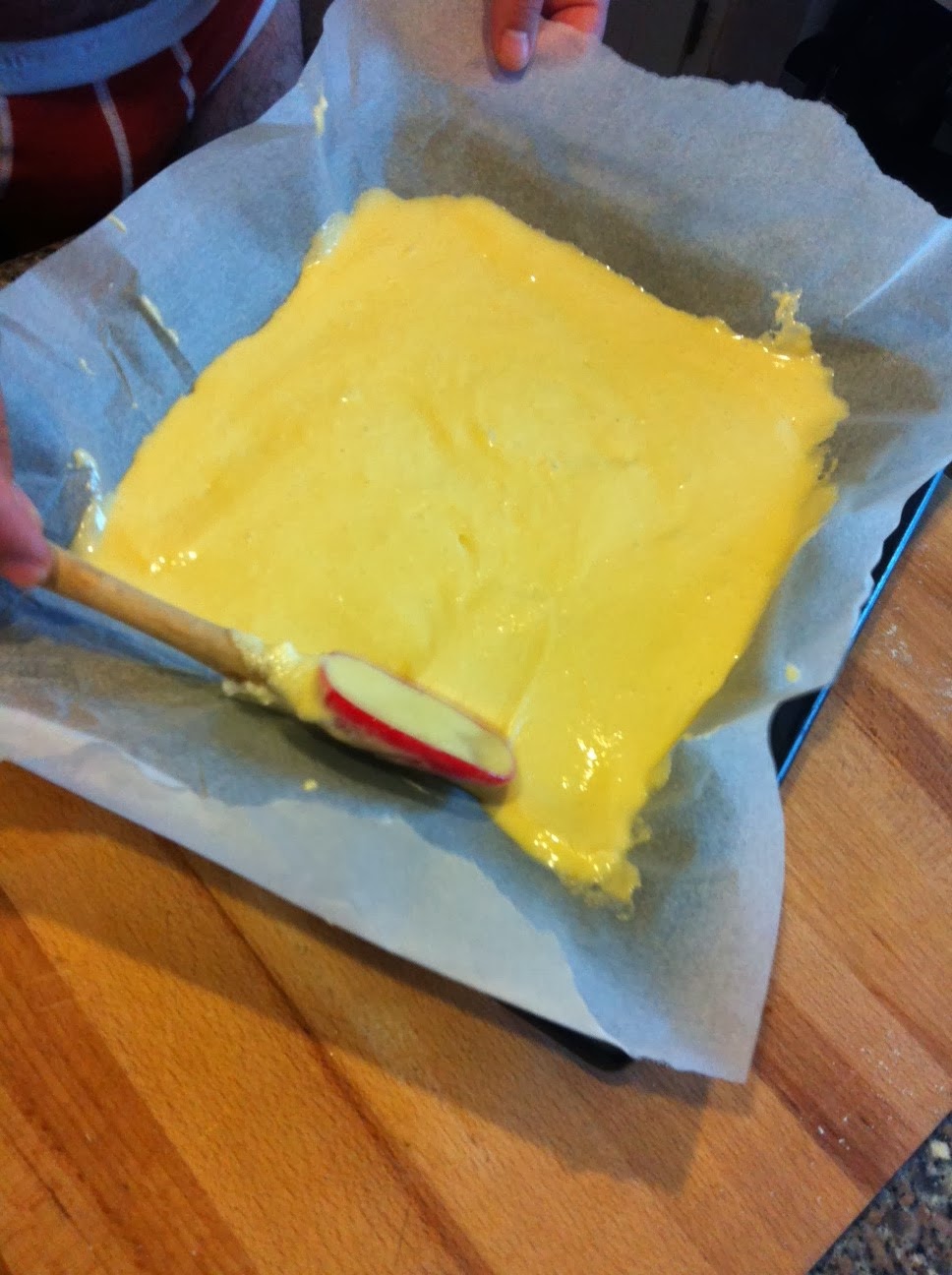 Foderate con carta da forno una teglia da forno rettangolare e travasate l'impasto.