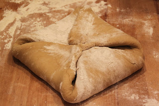 Estrarre l'impasto e stenderlo con le mani in forma più o meno quadrata sul piano ben infarinato. Ungersi le dita di olio evo e passarlo sulla superficie, infarinare e procedere con le pieghe prendendo i 4 lembi dell'impasto e portandoli al centro. Ripetere la piega per 3 volte.