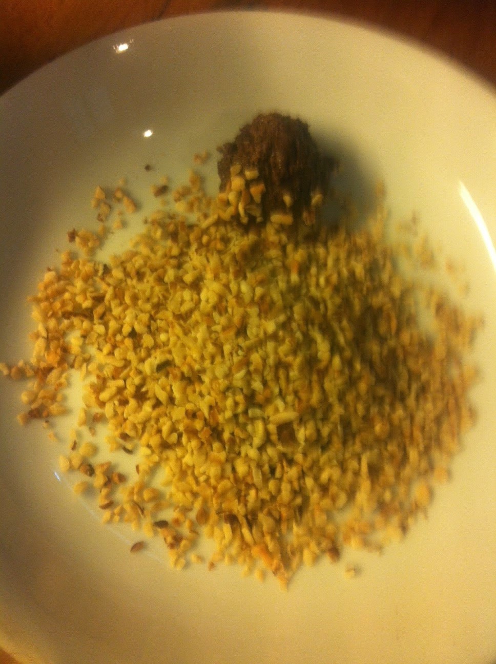 Preparare in un piatto la granella di nocciola, formare con "l'impasto cioccolatoso" delle palline che rotolerete nella granella.