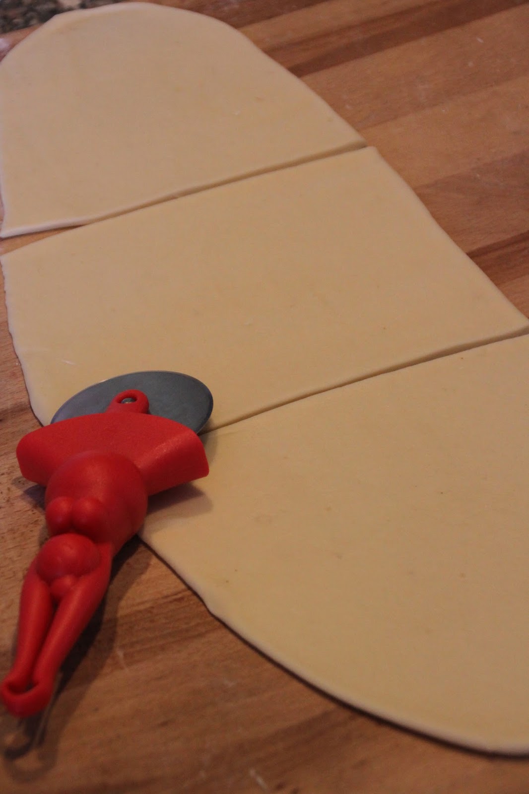 Tagliate con la rotella tante piccole striscioline ( lunghe ca 10 cm ) che arrotolerete su loro stesse per renderle più tonde e adagerete su una teglia foderata di carta da forno