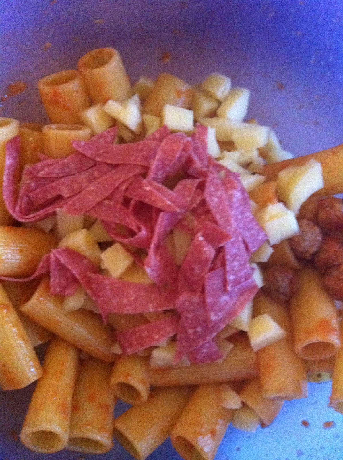 Lessate le uova e tagliate a listarelle il salame.