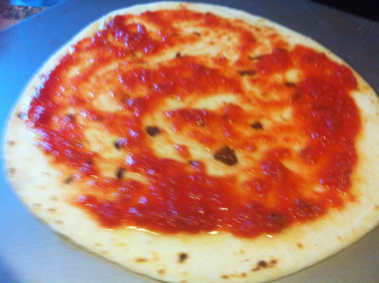 Mettete su una piadina 3 cucchiaiate di pomodoro.